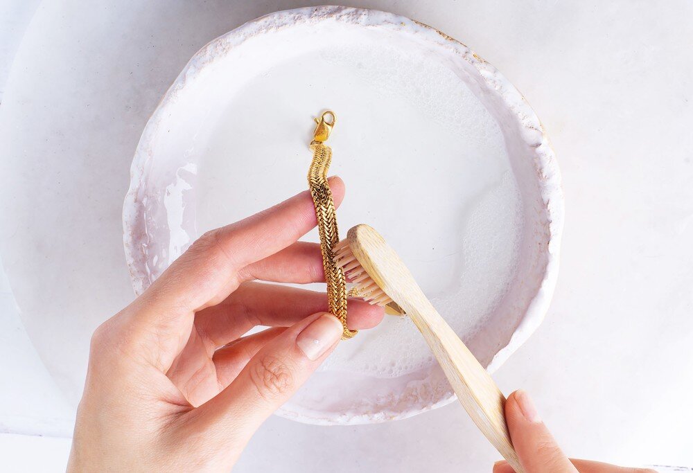 - При помощи старой зубной щетки, смоченной бензином, обрабатывают поверхности золотых украшений. К тому же, щетинки проникают в самые труднодоступные изгибы украшений.