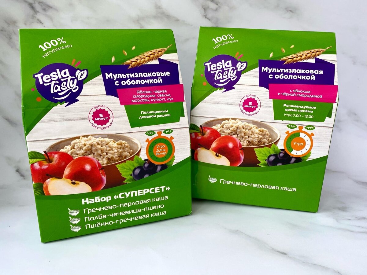 Недавно я открыла для себя каши Tesla Tasty. Их необычные вкусовые сочетания поразили не только меня, но и моего мужа. Но, давайте обо всём и по порядку) Купила я их на Ozon и Wildberries. Стоимость около 340 рублей за 1 такой набор. Набор гречнево-перловых каш для завтрака отлично выручает меня на работе. Вес каждого пакетика каши 30 грамм. Что характерно, данная каша не сладкая, но и не пресная. Довольно вкусная и сытная. С ней мне не нужен второй завтрак. Состав полностью натурален и это не может не радовать. Второй набор каш - суперсет. Я бы сказала, что это "кейс с едой на весь день". Набор из 3х каш для завтрака обеда и ужина. Заваривать можно как молоком, так и водой. Что касаемо каши на завтрак - я описала выше. А вот две вторых каши - это уже что-то необычное. Полба-чечевица-пшено с морковью и кунжутом понравилась не только мне, но и мужу. Можно кушать только кашу или использовать её как гарнир. Просто и вкусно - взял на работу пакетик каши и сосиски - вот тебе и сытный обед.