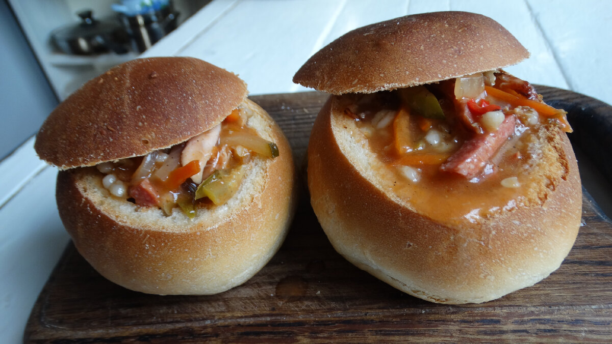 Не скажу, что моя свекровь, Инесса Карловна, капризная дама, она просто невероятно придирчивая. Чтобы ей угодить, думаю, и мешок пастилы будет мало подластиться. Но сейчас какой-то бубен у шамана стукнул, видимо, с правильной стороны, что моя свекровь похвалила обычный суп! Правда, даже самый простой супчик можно сделать таким вкусным, чтобы похвала была заслуженной. На самом деле рецептов солянки много. Это то блюдо, в которое по своему желанию и вкусу можно добавить разные продукты: лимон, каперсы, оливки, острый перец и т.д. Я лично предпочитаю баланс кислого, острого, сладкого вкуса. И хоть суп имеет красноречивое название «солянка», и по логики должен быть соленым, но намного интересней сделать вкус блюда объемным. К тому же, мой супчик имеет необычную подачу. Вернее, подача как раз самая традиционная для этого блюда. Суп подается вместе с хлебом, в самом хлебе. Получается очень удобно, 2 в 1: и суп, и хлеб. Это как раз подходит для таких, как мой муж, который первые блюда всегда