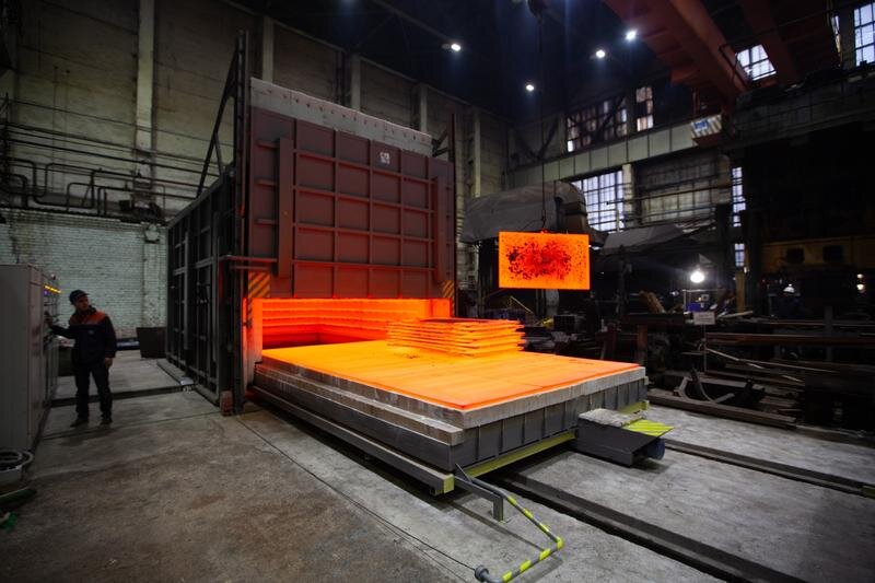 В цехе металлоконструкций № 7 сызранского завода «Тяжмаш» появилась обновка: для работы предприятия приобретены две новые электрические промышленные печи. «Горячая парочка» заменила три старые, работающие на мазуте, и уже активно включилась в производственный процесс. Новая техника работает по заданной программе и позволяет контролировать все необходимые параметры, а еще она не оказывает негативного воздействия на окружающую среду и более безопасна в эксплуатации. Например, печь ПВП 33.50.23/11М с выкатным подом и камерой габаритами 5х3,3х2,3 м: температуры в 1 100 °С она достигает со скоростью 150 °С/ч и применяется для нагрева листов перед их гибкой, а также для термообработки сварных конструкций.