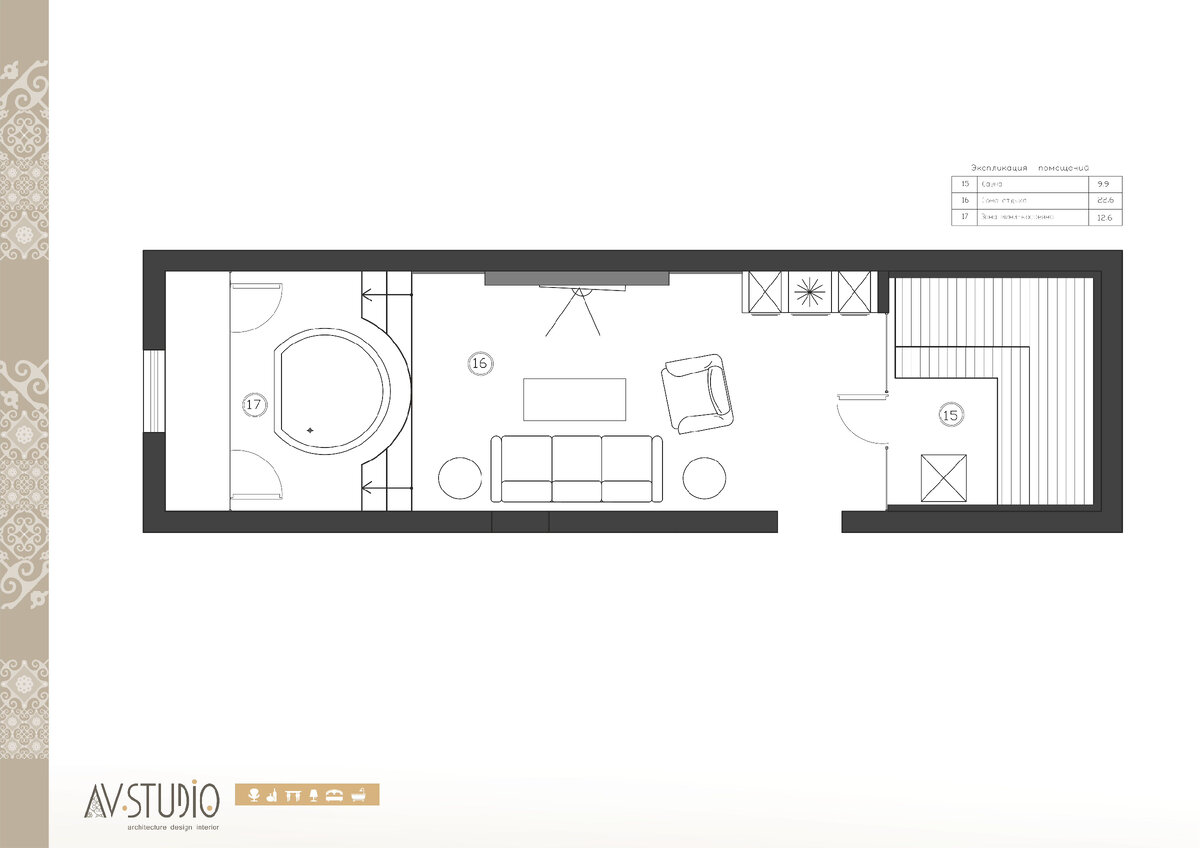 Дано: помещение в подвальном этаже, плохая освещенность – одно маленькое окно под потолком в торце вытянутой комнаты. Решение: