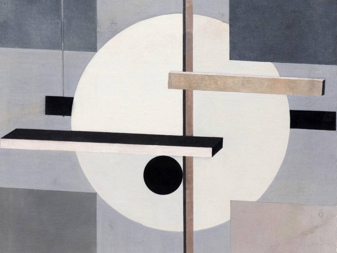 В композиции этой абстрактной картины широкие плоскости сочетаются с изящными объемными формами. В центре холста находится светлая окружность, которую художник лишь слегка сместил от центра картины. Это движение уравновешивается четырьмя прямоугольными плоскостями, помещенными в углах картины. Три узкие архитектурные формы парят перед светлым кругом. Кажется, что каждый объем освещен своим собственным источником света. Однако, ни одна из форм не отбрасывает тени ни на другие формы, ни на светлый диск на заднем плане. Благодаря этому положение отдельных элементов в пространстве остается неопределенным.