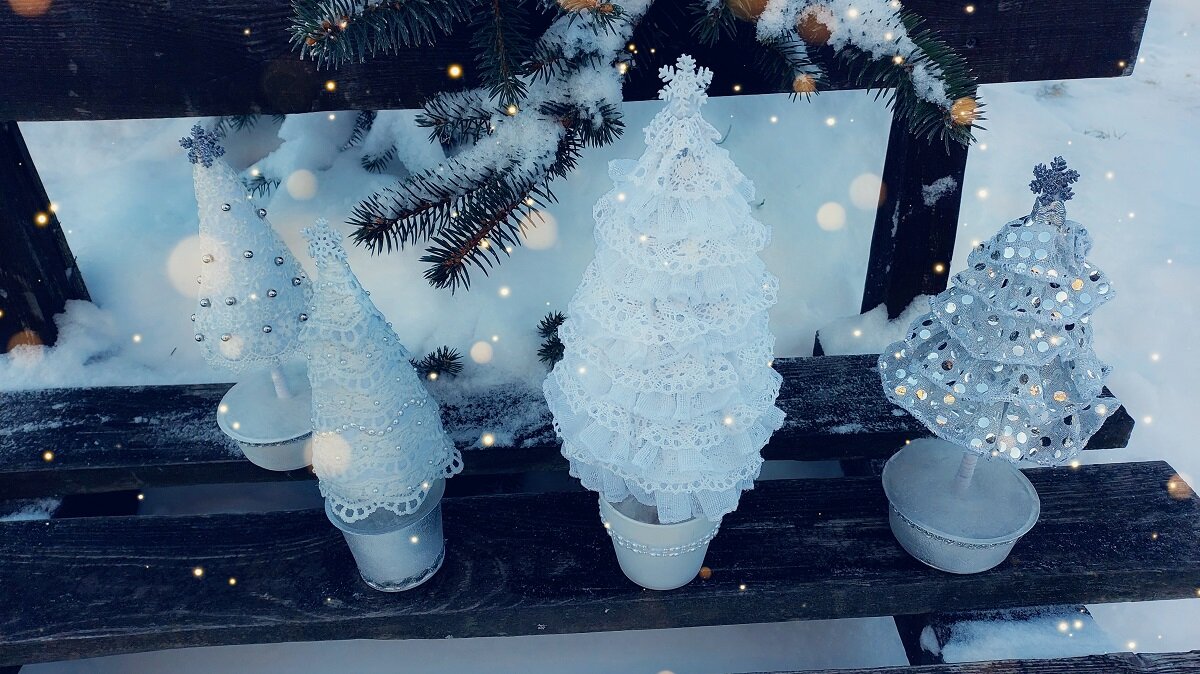 Из обрезков тюли и остатков кружева у меня получились очень красивые елочки. 4 варианта - для Вашего вдохновения.