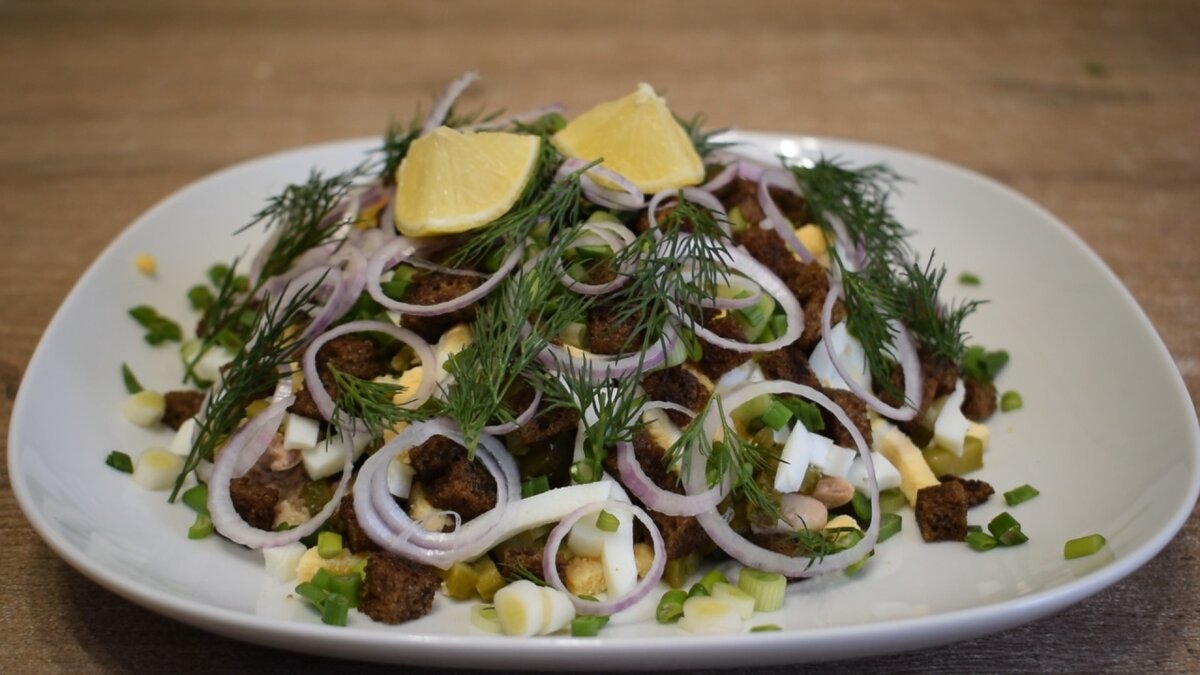 Ингредиенты: Печень трески – 1 банка Масло сливочное – 20 гр Хлеб «Бородинский» - 2 кусочка Огурцы маринованный – 120 гр Зеленый лук Красный лук Укроп Лимон Яйцо – 2 шт Рецепт приготовления: Черный хлеб режем на мелкие сухарики и обжариваем на сливочном масле до румяности. На блюдо выкладываем печень трески, слегка разминаем вилкой и распределяем по поверхности тарелки. Посыпаем зеленым луком. Посыпаем мелко нарезанными маринованными огурчиками и мелко нарезанными яйцами кладем сверху сухарики, зеленый лук и укроп, а так же кольца красного лука, поливаем салат соком лимона. Приятного аппетита! Кстати, я ранее уже делился этим рецептом на своём канале. Переходите и смотрите в формате видео. Так же рекомендую посмотреть: Обалденно вкусный салат: всего 4 простых продукта в составе (плюс заправка).Салат "Розовый фламинго" За уши не оторвёте от тарелки! Ещё один рецепт из свеклы и соленых огурцов! Со свеклой можно приготовить множество блюд, и сегодня вас ждет ещё один вкуснейший рецепт. Го