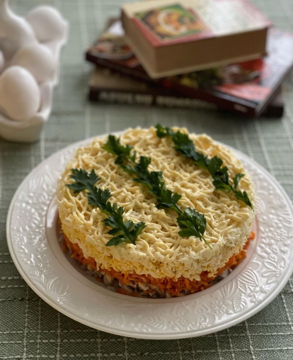 Чеснок пропустить через пресс и соединить с майонезом, перемешать и переложить для удобности в одноразовый кондитерский мешок. Салат формируем слоями, можно прибегнуть к помощи кондитерского кольца (диаметр 17/20 см). В такой последовательности, не забывая смазывать каждый слой сеточкой майонеза и посыпая специями: курица, морковь, яйца, сыр.