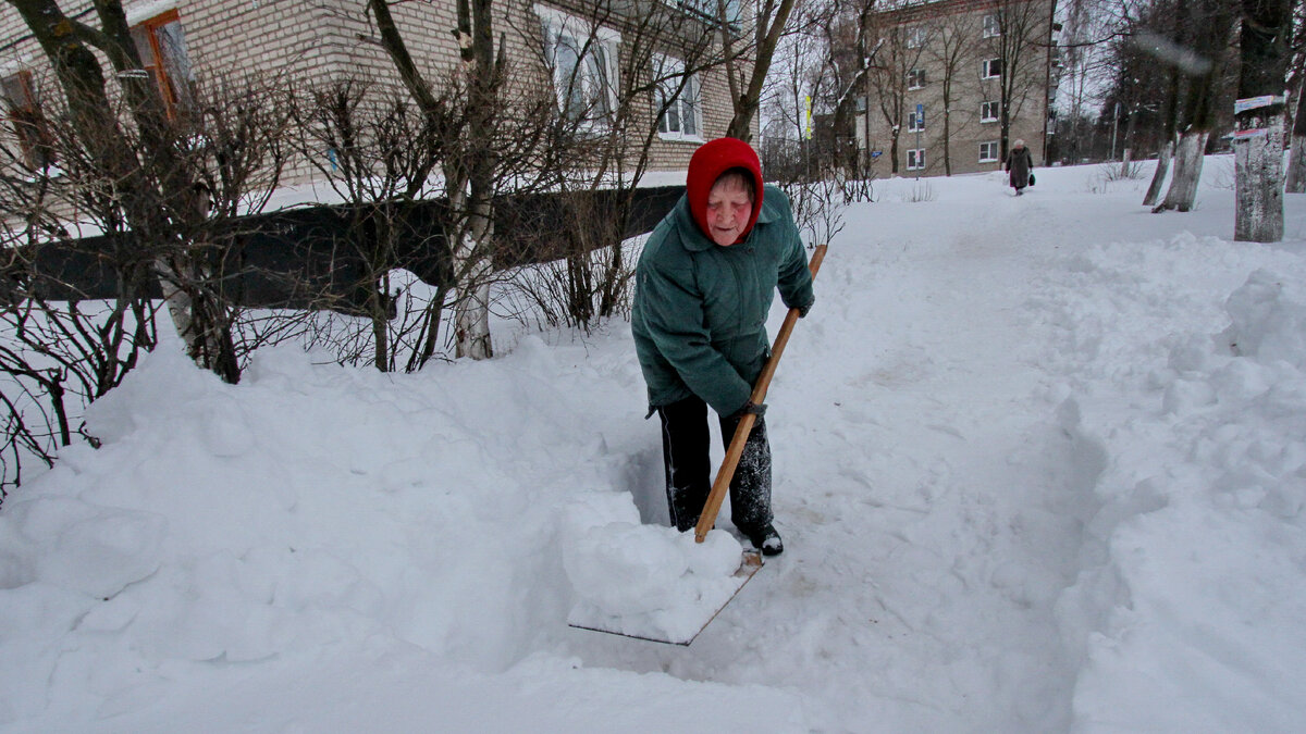 Но , тем не менее, вместо того, чтобы сидеть в тепле и ждать окончания смены, баба Поля возьмет вторую лопату и пойдёт на подмогу- расчищать дорожки...