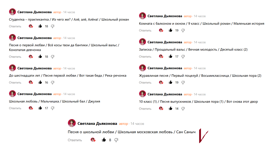 2-й тур мини-проекта. Здравствуйте! Посмотрим, как началось у нас голосование по любимым школьным песням о любви. Планирую этот проект завершить до Нового года (дальше у нас пойдут бардовские песни и подготовка к конкурсу), поэтому всем, кто им интересуется, советую заходить на канал каждый день. А сегодня мы говорим о тех музыкальных произведениях, у названий которых я поставила галочку. И это не значит, что песни хуже, чем другие, просто мы их не узнаём пока. А вот сейчас послушаем и вспомним. Песня о школьной любви Олег Николаев: "Песня о школьной любви" Андрея Куряева. Ну это просто про меня (и про миллионы влюблённых школьников). Я целый учебный год просидел за одной партой с "предметом" чувств и воздыханий! Зачем? Горят щёки и потеют ладошки... Оказалась именно предметом. Автор ролика - Иван Мирошниченко. Светлана: Однако! Олег, вы меня удивили. Песня-то не Андрея Куряева, это он просто исполняет очень даже нам знакомую песню Серафима Туликова на слова Владимира Харитонова