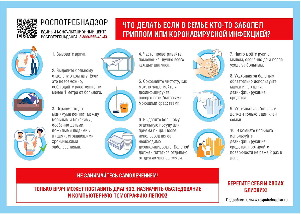 Что делать, если в семье кто-то заболел гриппом или коронавирусной инфекцией? ФБУЗ "Центр гигиены и эпидемиологии в Республике Бурятия" рекомендует придерживаться следующих правил: 1. Вызовите врача. 2. Выделите больному отдельную комнату. Если это невозможно, соблюдайте расстояние не менее 1 метра от больного. 3. Ограничьте до минимума контакт между больным и близкими, особенно детьми, пожилыми людьми и лицами, страдающими хроническими заболеваниями. 4. Часто проветривайте помещение, лучше всего каждые два часа. 5. Сохраняйте чистоту, как можно чаще мойте и дезинфицируйте поверхности бытовыми моющими средствами. 6. Выделите больному отдельную посуду для приема пищи. После использования ее необходимо дезинфицировать. Больной должен питаться отдельно от других членов семьи. 7. Часто мойте руки с мылом, особенно до и после ухода за больным. 8. Ухаживая за больным обязательно используйте маски и перчатки, дезинфицирующие средства. 9. Ухаживать за больным должен только один член семьи. 10.