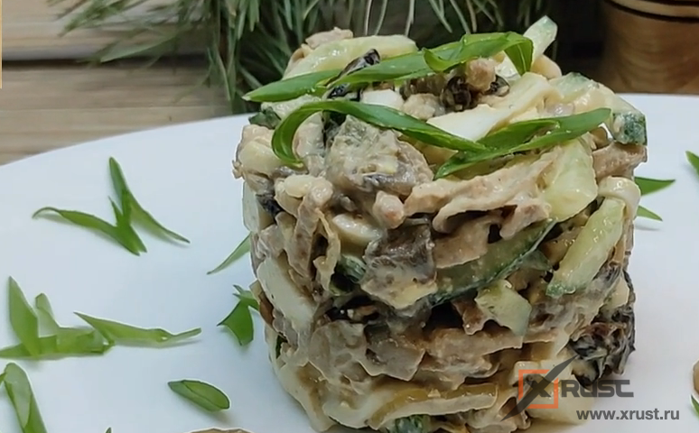 Все ингредиенты соединяем в салатнике. Заправляем салат сметаной или майонезом. Перчим