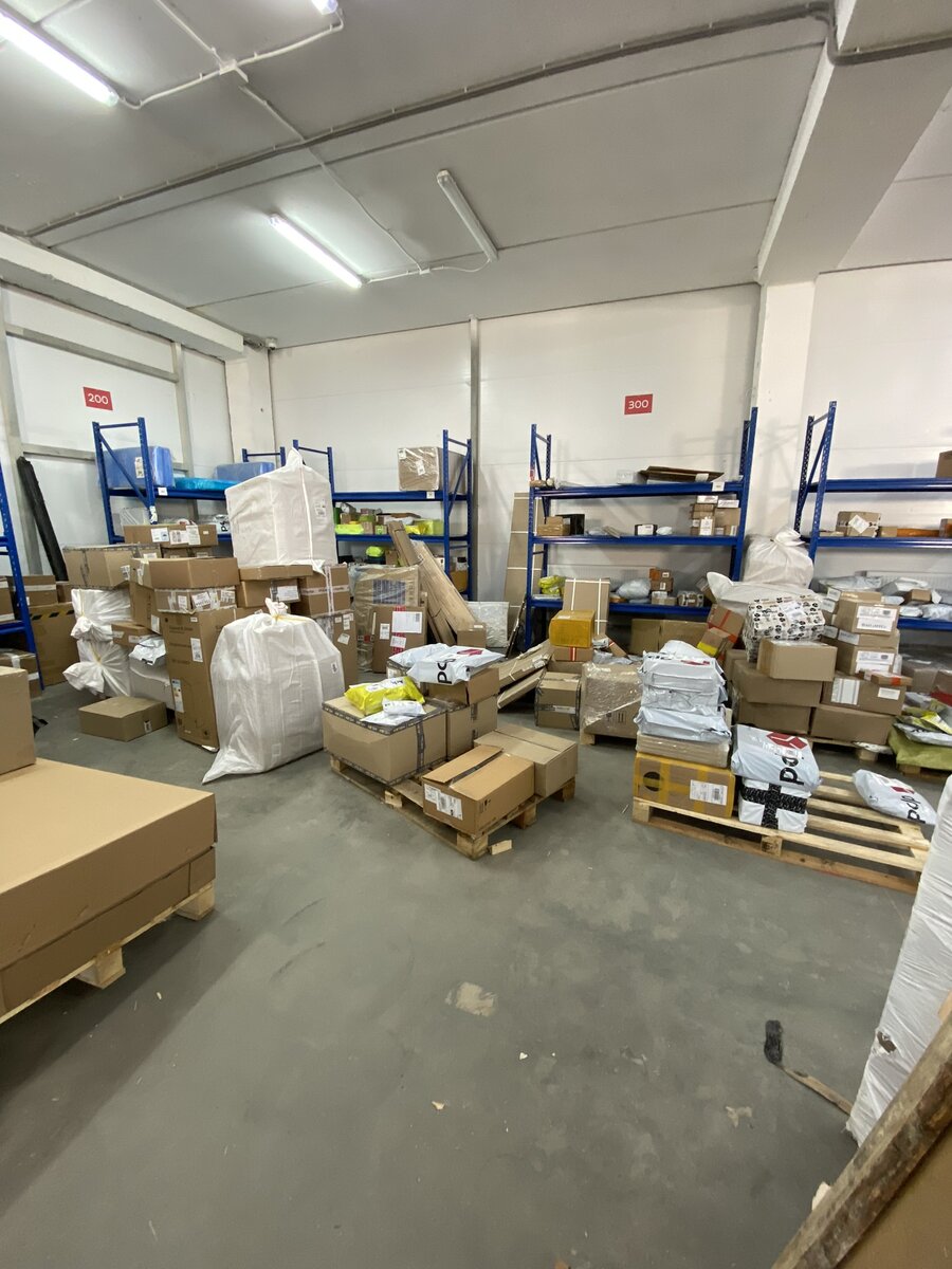 Как видите на фото все валяется. Обратившись к другим курьерам, которые копались в этих завалах сравнивая штрихкоды, мне подсказали, что на накладной указаны цифры "полок", например 500 и 600 и ты идешь искать эти цифры на стене над полками, значит в этом углу где-то валяется твоя посылка. Второй подсказкой для меня было, что раз я являюсь Водителем-Курьером-Грузчиком на грузовом транспорте, то и посылки мои самые большие. Мелкие соответственно разбирают курьеры, которые возят на легковых машинах.