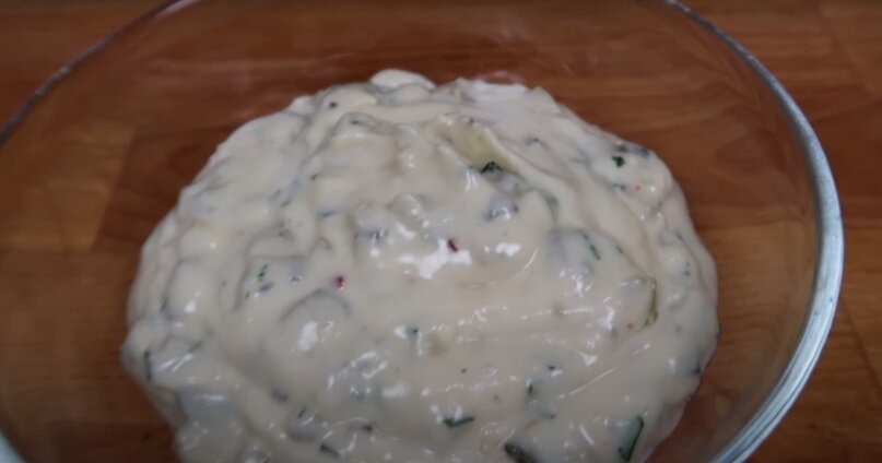 При помощи электрического венчика взбиваем соус Тартар, одновременно вливая тонкой струйкой растительное масло. Масла нужно примерно 150-200 мл. И взбивать будем до состояния белесого крема. Соус получается густой. Отставляем его в сторону.