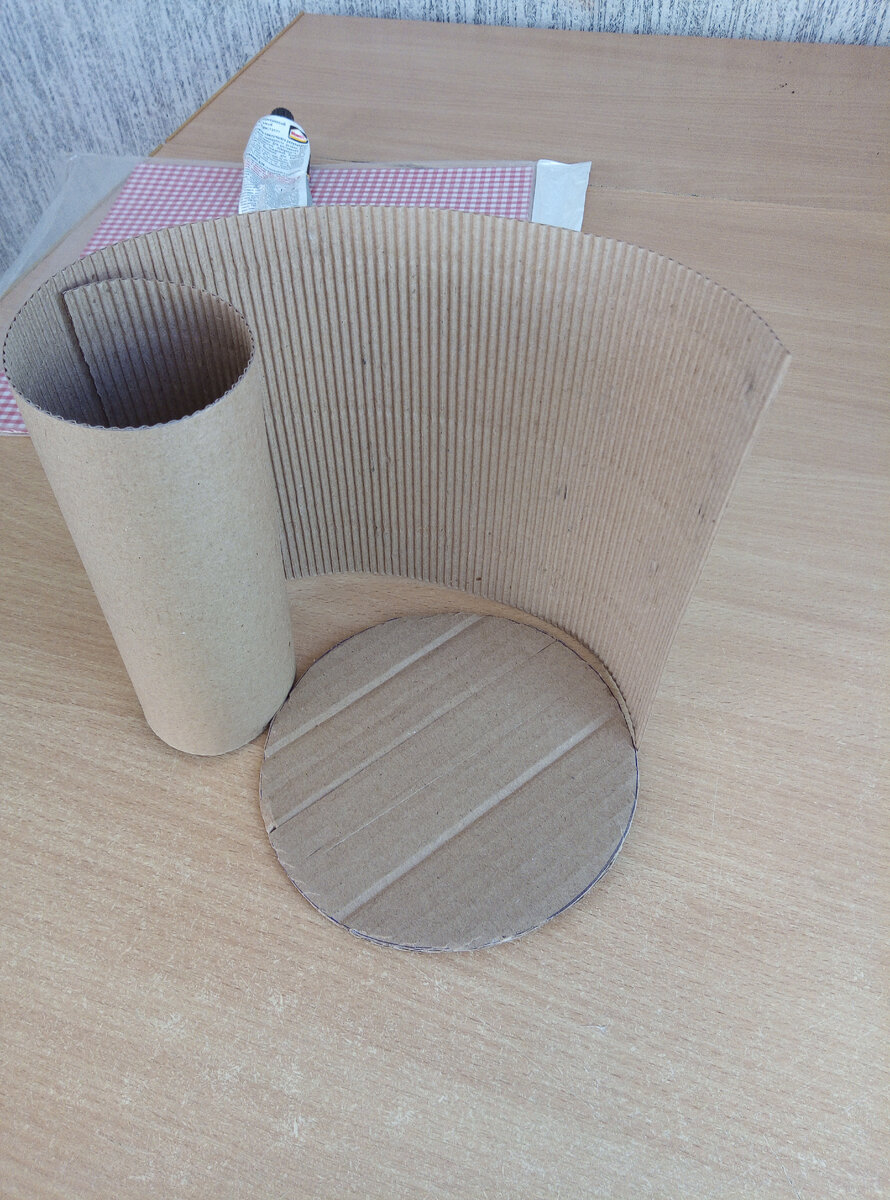 Всем привет. Сегодня буду делать новогодний букет. Сначала сделаю шляпную коробку. Из картона делаю заготовку-круг. Из гофрокартона, по периметру круга делаю стенку. Обклеиваю заготовку плотной бумагой, с одного боку с нахлестом 0,5 см, и снизу примерно 2см. Нижнюю часть прорезаю вот такими треугольниками. Украшаю красивой карточкой лицевую сторону. Склеваю заготовку по боковой части. Нижнюю часть склеиваю с круглым дном. С лицевой стороны добавляю ленту из гофрокартона,она скроет линию склейки с дном. Внутрь приклеиваю кусок пенопласта, добавляю ленточку-ручку. Теперь собираем букет) Можно использовать веточки ели, искусственные цветы хлопка, ёлочные игрушки и т. д. Вот что у меня получилось.. Всем пока.