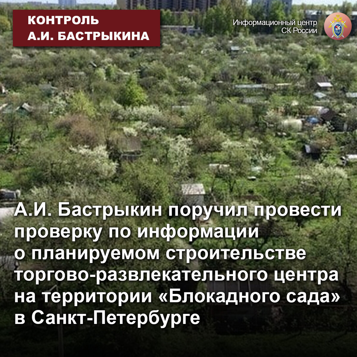 А.И. Бастрыкин поручил провести проверку по информации о планируемом строительстве торгово-развлекательного центра на территории «Блокадного сада» в Санкт-Петербурге