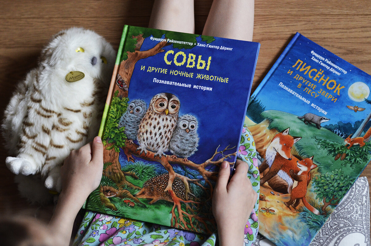 Чем лесной кот отличается от домашнего кота? Почему светлячки светятся? Что едят ежи? Почему кожа у саламандры яркой расцветки? Что любит бабочка мертвая голова? И откуда у нее такое название? Почему птицы боятся филина? Эти и еще множество вопросов разбираются в книге автора со сложно произносимыми именем и фамилией Фридеруна Райхенштеттера «Совы и другие ночные животные. Познавательные истории» с иллюстрациями Ханса-Гюнтер Дёринга, выпущенной «ЭНАС-КНИГА». У нас это вторая книга серии «Давай познакомимся». Первая была этих же авторов «Лисёнок и другие звери в лесу». Мне и дочке понравилось первое издание, поэтому мы решили продолжить знакомство с животными и птицами с этой серией. Обе книги одинакового формата 21*28 см с твердым переплетом, полностью цветные, с приятной матовой мелованной бумагой внутри и отличный качеством печати. Яркие иллюстрации, достаточно крупный текст, удобное внутреннее оформление. Самое важное – это информационное наполнение. Мне нравится баланс между количе
