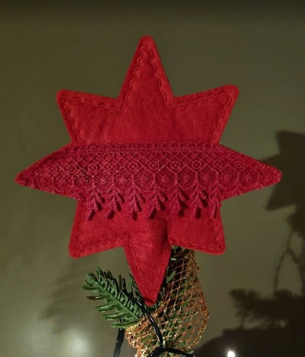 Порядок работ. 1. Шаблон обводим мелом или мылом * 2 детали. 2. Обработка декоративной строчкой (фото №1)* 2 детали. 3. Пришиваем кружево. Предварительно белое кружево можно покрасить краской. (фото №2) 4. Вырезаем грани после обработки одного луча, соединяем две детали. Обработка декоративной строчкой. (фото №3) 5. Закрываем нитки.