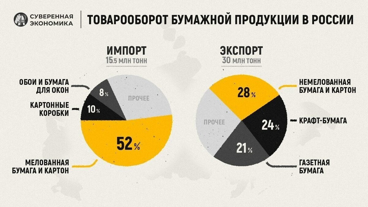 Взглянем на общее состояние индустрии. Сегодня Минтранс предложил запретить европейским перевозчикам ввозить в Россию картон и бумагу. Рассказываем как сейчас обстоят дела с бумагой в России? Для начала взглянем на общее состояние индустрии. С 2013 по 2022 год импорт российских предприятий в области бумажной продукции превысил 15,5 млн тонн бумаги и картона, экспорт же был вдвое больше – 30 млн тонн. Основные экспортные статьи: немелованные бумага и картон (27,6%), газетная бумага (21%) и крафт-бумага (24%). Основная статья импорта в Россию – мелованная бумага и картон, на которые приходится аж 51,6% от всех ввозимых товаров. Другие интересные категории: обои и бумага для окон (8,1%), а также картонные коробки (10,1%). Дефицит бумаги, с которым Россия столкнулась на короткий промежуток в марте 2022 года, был связан в первую очередь с приостановкой крупнейшего в стране Светогорского целлюлозно-бумажного комбината (ЦБК), на котором возникли проблемы с поставкой химических реагентов из Фи