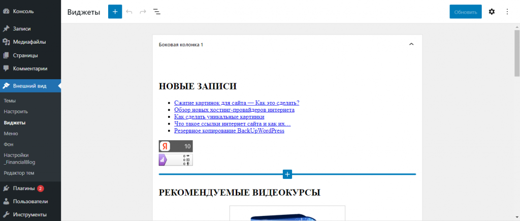 Здравствуйте дорогие читатели моего блога. Сегодня я хочу поговорить о работе с виджетами на WordPress блоге. Ведь мы знаем, что на любом блоге есть виджеты, но не все понимают, что это такое и как их туда добавить. Так вот вы и разберетесь в этой теме прочитав статью до конца. Может не для всех эта статья будет актуальна, но я уверен, что есть еще те кто не знает как это сделать. Сегодня я расскажу и покажу как можно добавить рубрики на свой WordPress блог с помощью виджетов. Итак начнем. Работаем с виджетами на WordPress блоге Сначала разберемся, что же такое виджеты. Виджеты это программные блоки в которые можно записывать исходные данные и они будут отображаться на блоге. Это сделано для упрощения работы с блогом для тех кто не знает как работать с кодом. Ну вот вроде бы вводная часть завершена и можно поговорить непосредственно о работе с виджетами на WordPress блоге. Добавить виджеты на боковую колонку своего блога можно двумя путями, через админку WordPress’a, а именно: 1. зайт