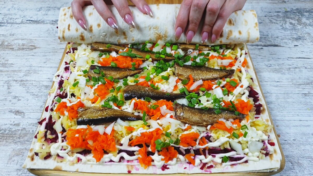 Вместо скучной и надоевшей «Селедки под шубой»: беру банку шпротов, лаваш и готовлю праздничный салат в рулете