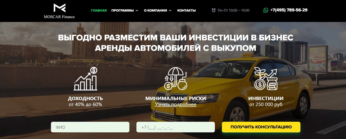 Вот вы во что инвестируете? В акции? Облигации? Валюту? А могли бы в такси. Ну, не совсем в такси, а в арендный бизнес, предполагающий сдачу автомобилей в аренду с последующим выкупом. Что это такое, разберемся на примере предложений от Moscar Finance. О компании Moscar Finance – это бренд, под которым осуществляет свою деятельность компания, зарегистрированная в качестве ООО «Миллениум» в 2019-м году. Основное направление деятельности компании – предоставление в аренду автомобилей, с возможностью последующего выкупа. Данный арендный бизнес функционирует, в том числе за счет средств инвесторов. В настоящее время с проектом на постоянной основе сотрудничает 30 инвесторов, а в управлении в общей сложности находится 230 автомобилей и около 200 миллионов рублей. Предложения Инвестиции с Moscar Finance предполагают вложения, которые идут на приобретение новых автомобилей. Прибыль формируется за счет выплат арендаторов. В среднем, обещанный доход составляет около 24% годовых, при условии, чт