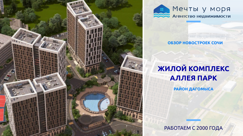 Жилой комплекс «Аллея Парк» — это маленький город в центральной части Дагомыса. Жилой комплекс «Аллея парк» располагается на 5,5 га в микрорайоне в «Дагомыс» на Батумском шоссе (трасса федерального значения), примерно в 800 метрах от моря. По соседству с ЖК «Аллея парк» находится оздоровительный комплекс для сотрудников аппарата президента России — «Дагомыс». Жилой комплекс состоит из 4 20-этажных корпусов В каждом корпусе на 20 этажей: 4 лифта (2 пассажирских и 2 грузовых) Монолитно-каркасный дом Витражное остекление, каждой квартиры Дизайнерский холл с ресепшн Квартиры от 29,9 кв.м. Паркинг: отдельно стоящее здание, на 1020 машиномест Свой парк и бассейн на территории На территории комплекса будут расположены детская площадка, современный открытый бассейн с кафетерием у зоны отдыха, 2 теннисных корта, баскетбольная площадка, аллея с прогулочной зоной. До моря 1 км Чистые и просторные пляжи Инфраструктура уже есть: школы, садики, больница, магазины Коммуникации в корпусах все