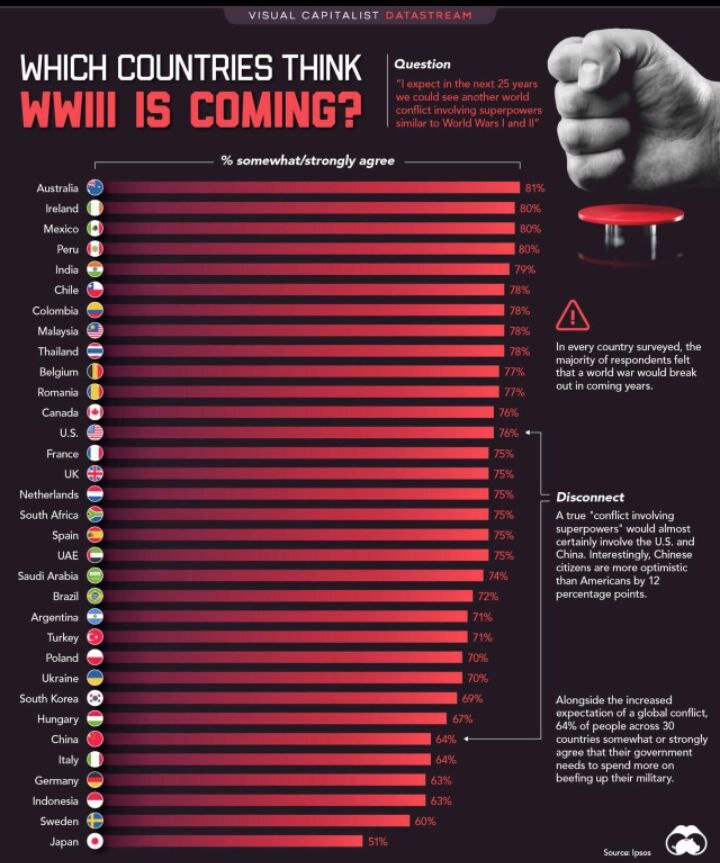 Недавний опрос Ipsos (мировой лидер в области маркетинговых исследований), населения в 33 странах мира наводит на тревожные думы. В то, что в самые ближайшие годы между мировыми сверхдержавами произойдет война, подобная Первой или Второй мировой, верит огромное количество людей планеты. Как видно из графика, больше всех в это верят австралийцы. Меньше - японская нация. В США, находящихся во втором десятке, в вероятность войны верит очень значительная часть населения - 76%. Констатируя, можно смело утверждать, что во всех 33 странах Третью мировую войну ожидает больше половины населения. Как хорошо известно спецам информационно-психологической войны - ожидание войны убивает лучше самой войны.