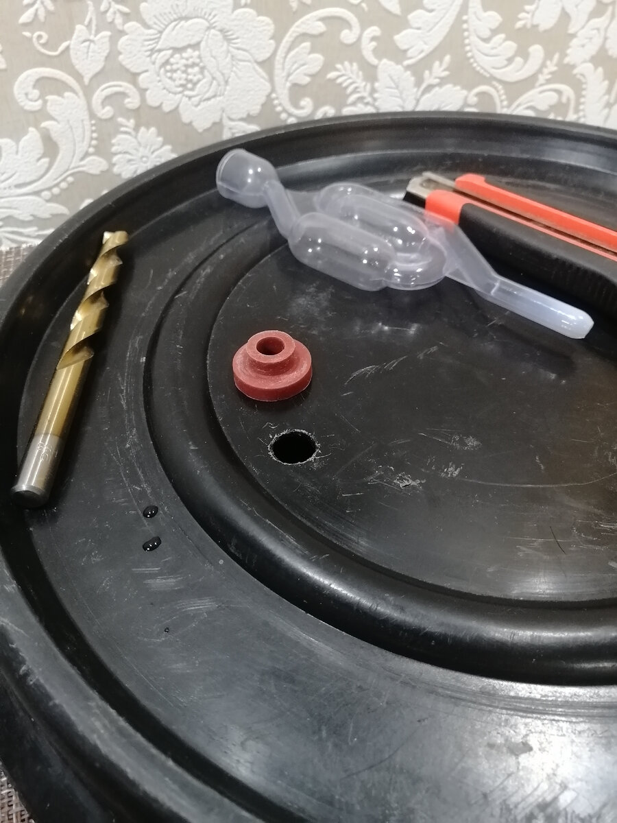 Всем привет. С вами Самогон ТВ. Ранее я писал, что решил больше не устанавливать гидрозатвор на свои бродильные ёмкости. Естественно, на тех, где уже он установлен, оставил как есть. А вот новую бочку на 65 литров было решено не "дырявить". При этом, несколько заторов, в частности зерновых, достаточно успешно сработали, просто накрытые крышкой. Однако, как выяснилось, не всегда и не всё гладко. Возможность словить заразу и недоброд, всё-таки сохранилась. Причём наглядно мне это продемонстрировала пшеничная брага, которая покрылась красивым узором и "одарила" небольшим, но пригаром после первого её перегона) В общем, в итоге, решено было не "выделываться", и установить в крышку бочки гидрозатвор. Особых проблем это не приносит, а от каких то может и избавит. Особо заморачиваться не пришлось. "Вооружившись" сверлом на "10"( крупнее под рукой не оказалось) и шуруповёртом, принялся за дело. Пока "шурик" заряжался, понял, что отверстие смогу спокойно просверлить вручную. Сверло