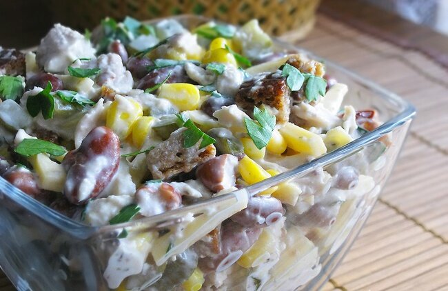 Этот салат на мой взгляд тоже интересный для новогоднего стола. Напишите, пожалуйста, в комментариях, а вы как считаете? Что нам понадобится? 🎄Фасоль консервированная красная (банка) 🎄Курица (филе или копченая) 1-2 шт. 🎄Кукуруза консервированная (1 банка) 🎄Сыр твердый 🎄Маринованные огурцы 3-4 шт. 🎄Сухарики бородинские 🎄Соль 🎄Майонез/сметана/оливковое масло по вашему вкусу Приготовление Сыр трем на крупной терке. Курицу можно отварить или пожарить. А если копченая, то просто нарезать ее. Огурцы нарезаем на дольки или ломтики. Как вам больше нравится. Добавляем кукурузу и фасоль. Перемешиваем. Не забываем солить. Заправляем майонезом/сметаной или оливковым маслом. Сверху посыпаем сухариками. Приятного аппетита!