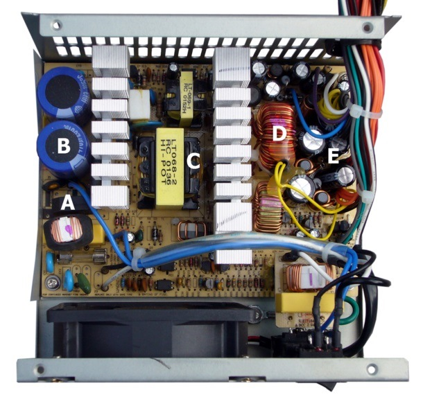 Силовые конденсаторы могут длительное время держать заряд, поэтому не стоит прикасаться к ним голыми руками сразу после отключения питания. Ни в коем случае не стоит прикасаться к плате или радиаторам при подключенном к сети блоке питания.