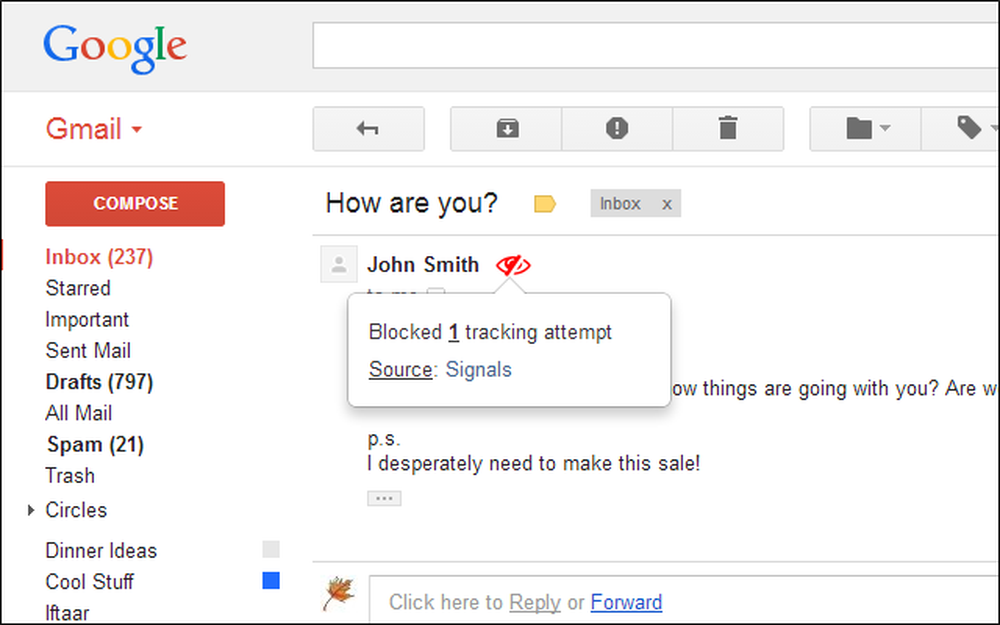 2. После запуска уже всё готово — все электронные письма, которые хотят вас отследить, будут помечены иконкой «красный глаз». Кроме уведомления, сервис автоматически блокируют такую слежку.