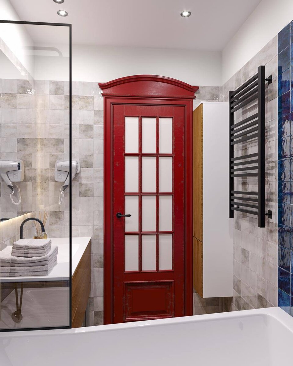 Одним из самых интересных интерьерных решений в проекте «Китч» дизайн студии «Мастерская Комфорта» стали выполненные на заказ яркие, красные двери в санузел. Первая (верная) ассоциация, которая возникает при взгляде на них, это телефонные будки в Англии, которые уже стали визитной карточкой страны.