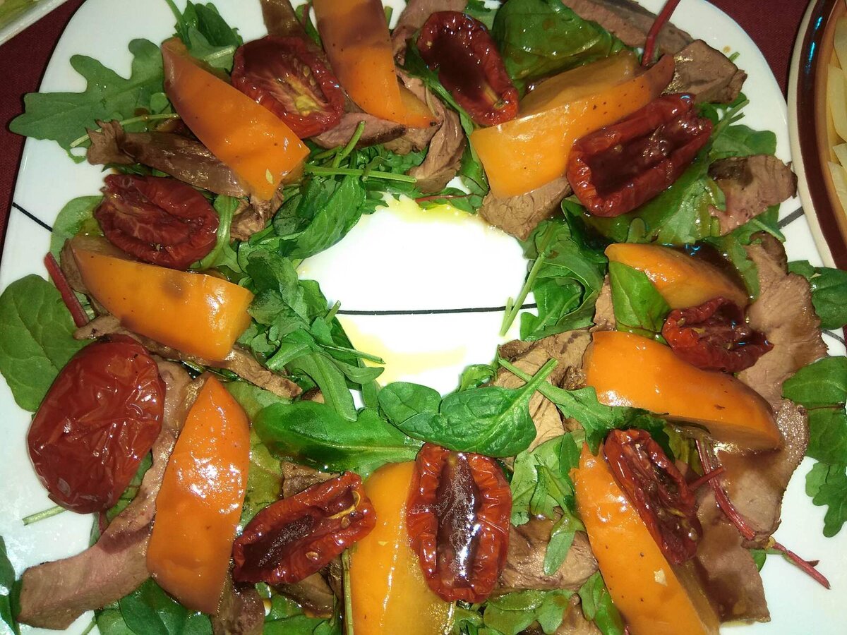 Взрыв вкуса! - мясо с вялеными помидорами и хурмой. Ценителям классического ростбифа этот салат придется по душе!