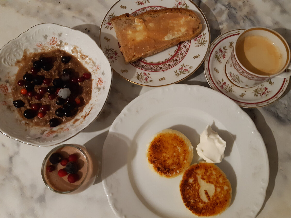 завтрак сегодняшний: льняная каша с шоколадом, я сверху еще ягоды положила, сырники со сметаной, кофе, бутерброд с икрой минтая, десерт из ряженки с бананом и шоколадом. Я села завтракать в 7 утра. И потом спокойно до 12 ч жила. Есть не хотелось вообще. Коллеги пили кофе, ели фрукты, конфеты, я спокойно без этого обошлась.