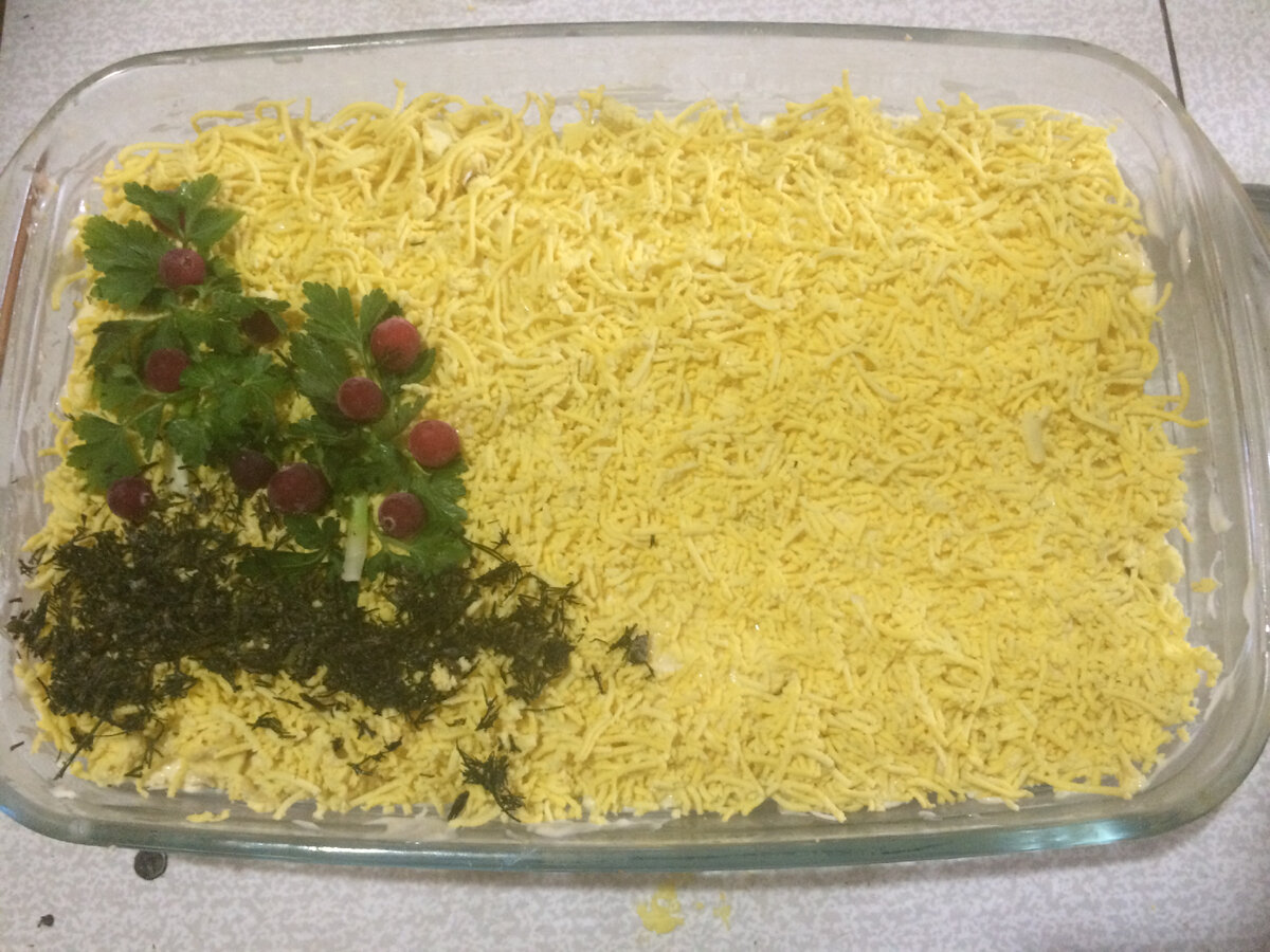 Этот салат - сторожил на моём праздничном столе. Я готовлю его уже более 35 лет. Он со мной отмечает все знаменательные даты в нашей семье. Салат по своему составу чем-то напоминает Мимозу. Только в настоящую Мимозу кладут варёную морковь, а здесь её нет, зато есть яблоки. Почему "Французский"? - не скажу. С таким названием я впервые узнала салат по этому рецепту. Может быть из-за тонкого, изысканного вкуса и необычного сочетания ингредиентов, которыми являются самые обычные продукты. Все продукты для салата уже закуплены и ждут своего часа. Яйца - 5 шт Консервы Горбуша или Лосось - 1 банка Лук - 1 небольшая луковица Яблоко - 1 шт Масло сливочное - 50 гр. Сыр - 100 гр. Майонез Приготовление Ложкой разношу майонез по поверхности. Можно положить в пакет, срезать у пакета уголок и сделать майонезную сеточку. Можно делать салат не в стеклянной форме, а слои раскладывать на обычной тарелке, как изображено в центре этого стола на тарелке с голубой каёмкой. Можно особо не заморачиваться с тем