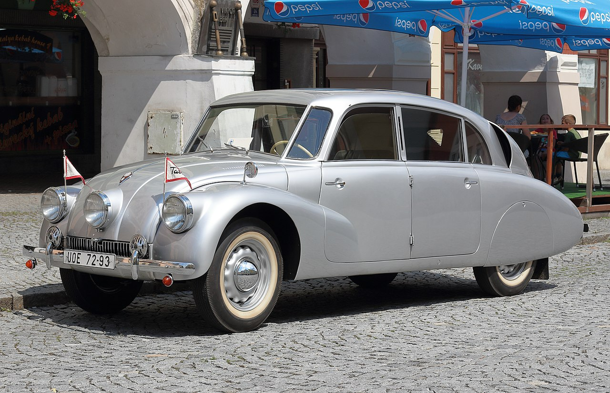 А это что за серебристая красавица с тремя фарами? Да это же легендарная Tatra 87! Эту машину серийно стали выпускать в 1938 году. Всего было сделано чуть больше 3000 экземпляров. Tatra 87 не просто стильно выглядела, но и благодаря тщательно продуманной аэродинамике развивала скорость до 160 км/час, чем могли похвастаться далеко не все автомобили той эпохи. Но при этом она еще и расходовала меньше топлива. Правда, стоила недешево. Машина могла быть и других цветов. Но на мой взгляд, серебристая - самая стильная. Tatra 87 была признаком высокого статуса. На ней ездили легендарная чехословацкая автогонщица Элишка Юнкова и поэт Витезслав Незвал, король Египта и Судана Фарук I, президенты Чехословакии К. Готвальд и А. Запотоцкий. Во время Второй мировой "Татру 87" очень полюбили немцы. На ней ездили фельдмаршал Э. Роммель и авиаконструктор Э. Хейнкель. Согласно полулегендарной истории, ее называли "убийцей немецких офицеров", так как, якобы, на высокой скорости они нередко теряли управлен