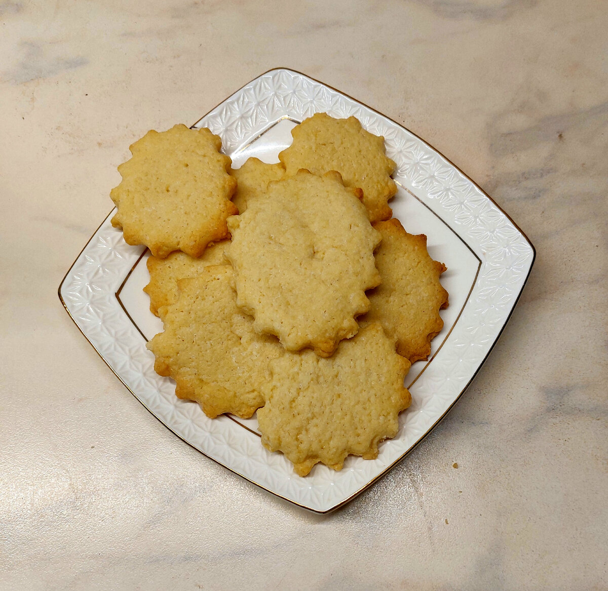 Когда я увидела в интернете этот рецепт, у меня просто руки зачесались его побыстрее воплотить в жизнь: такое предлагалось здоровское решение декора! Я уже не просто представляла, я уже даже "видела" свои шедевры!.. Задумано? - сделано! И все с точностью до грамма, как того требовал рецепт. Однако... вот очень жаль, что это "одноко" , порой, нарушает все планы... Нет, само тесто очень вкусное и ароматное! И я впредь обязательно буду такое печенье делать еще и еще. Но декор!!! - декор, который меня так восхитил - выполнить с этим тестом, мягко говоря, очень проблематично, если вобще невозможно: тесто очень крохкое и мне, увы, пришлось отказаться от своих шедевральных планов. Я просто нарезала палочку теста на кружки и испекла обычное печенье. Кружки при резке крошились, приходилось их склеивать и латать, выравнивать... выходили неэстетичные лепешки... Тогда, чтобы придать печенью цивильный вид, я придумала обрезать края волнистым колесиком. Этот вариант меня уже устроил. Рецептом