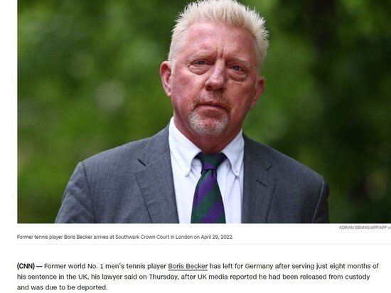 Бывший теннисист №1 в мире среди мужчин Борис Беккер уехал в Германию, отбыв восемь месяцев своего срока в Великобритании. Об этом сообщил его адвокат после того, как британские СМИ опубликовали новость о его освобождении из-под стражи. Сообщалось, что он должен быть депортирован. Беккер «отбыл наказание и не подлежит никаким уголовным ограничениям в Германии», — говорится в заявлении его адвоката Кристиана-Оливера Мозера. Мозер не предоставил никаких дополнительных подробностей о местонахождении Беккера в Германии и сказал, что на любые просьбы об интервью «не будет ответа». Беккер был освобожден из британской тюрьмы, отбыв всего восемь месяцев своего наказания, и должен был быть депортирован из Великобритании, сообщает PA Media . «Любой иностранный гражданин, осужденный за преступление и приговоренный к тюремному заключению, рассматривается как подлежащий депортации при первой же возможности», — говорится в заявлении Министерства внутренних дел. Борис Беккер, родом из Германии, живет