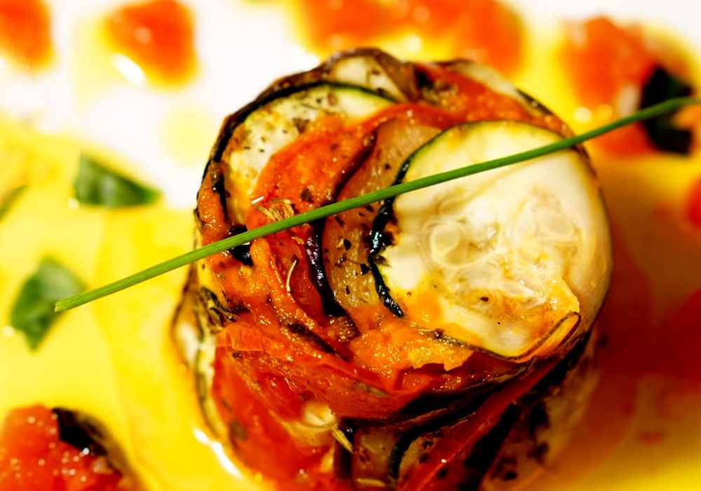 Рататуй обычно готовится из цуккини, томата, репчатого лука и болгарского перца, но как правило, сейчас уже не встретишь это блюдо без использования баклажана. Итак, следуйте описанию этого рецепта и готовьте вкусный рататуй.