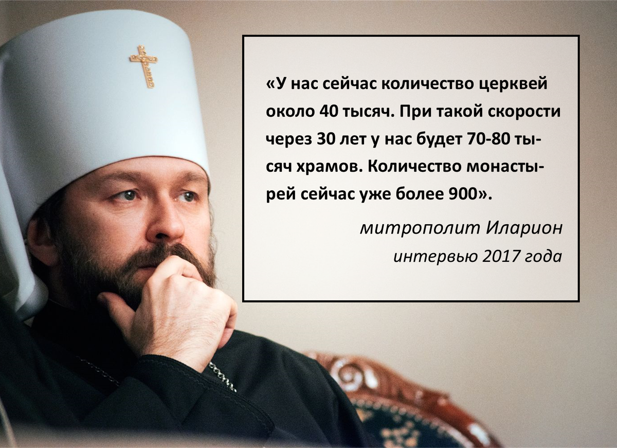 Недавно случайно наткнулся на новость, что в России церквей только одной РПЦ стало по числу больше, чем среднеобразовательных школ, городских и сельских вместе взятых. В России убывает количество школ. Не удивился, но решил проверить. В результате получасовых поисков появилась такая табличка - сводные данные за десять лет с 2010 по 2019 года. Начал с количества школ - нашёл вот такую подробную статистику по десятилетиям со времён Российской империи по настоящее время. Для наглядности вот оттуда такой график по количеству школ. Ну а как обстоят дела с церквями РПЦ? Ну вот например митрополит Илларион в декабре 2017 г. дал такое интервью. По его словам церквей уже почти 40 тысяч, а монастыре более 900. В планах РПЦ через 25-30 лет удвоить количество храмов и достигнуть уровень царской России с её почти 80 тысячами церквей. По 2-3 православных храма в день. При «кровавом тиране» Сталине в таких объёмах строили фабрики, заводы и друге предприятия. Тут наверно возникает путаница сколько цер
