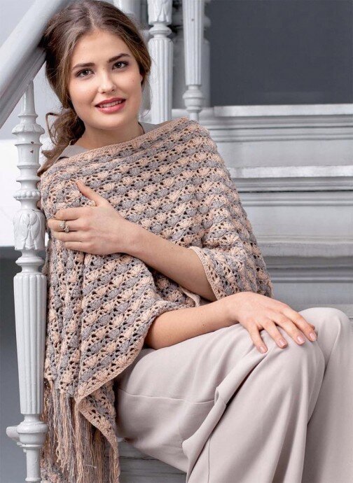 Свяжите два прямоугольных полотна, соедините их и вплетите по краям бахрому – ваше нежное и женственное пончо готово. РАЗМЕРЫ Единый размер ВАМ ПОТРЕБУЕТСЯ Пряжа (41% хлопка, 32% полиэстера, 27% льна; 125 м/50 г) – по 400 г абрикосовой и песочной; крючок №4. ОСНОВНОЙ УЗОР Число петель начального ряда кратно 10 + 3. Вязать согл. схеме. Начать с петель перед раппортом, раппорт постоянно повторять, закончить петлями после раппорта. Выполнить 1 раз 1–6-й ряды, затем постоянно повторять 3–6-й ряды, соблюдая последовательность цветов. ПЛОТНОСТЬ ВЯЗАНИЯ 19,5 п. начального ряда х 13 р. = 10 x 10 см. ВЫКРОЙКА ВЫПОЛНЕНИЕ РАБОТЫ СПИНКА Абрикосовой нитью выполнить цепочку из 233 в.п. + 1 в.п. подъема и вязать основным узором. Через 42,5 см = 55 р. от начального ряда закончить работу 2 рядами ст. б/н абрикосовой нитью = 43 см от начального ряда. ПЕРЕД Вязать, как спинку. СБОРКА Выполнить плечевые швы с обеих сторон на 35 см. В боковые края вплести в полосу каждого цвета 1 пучок бахромы идентичного