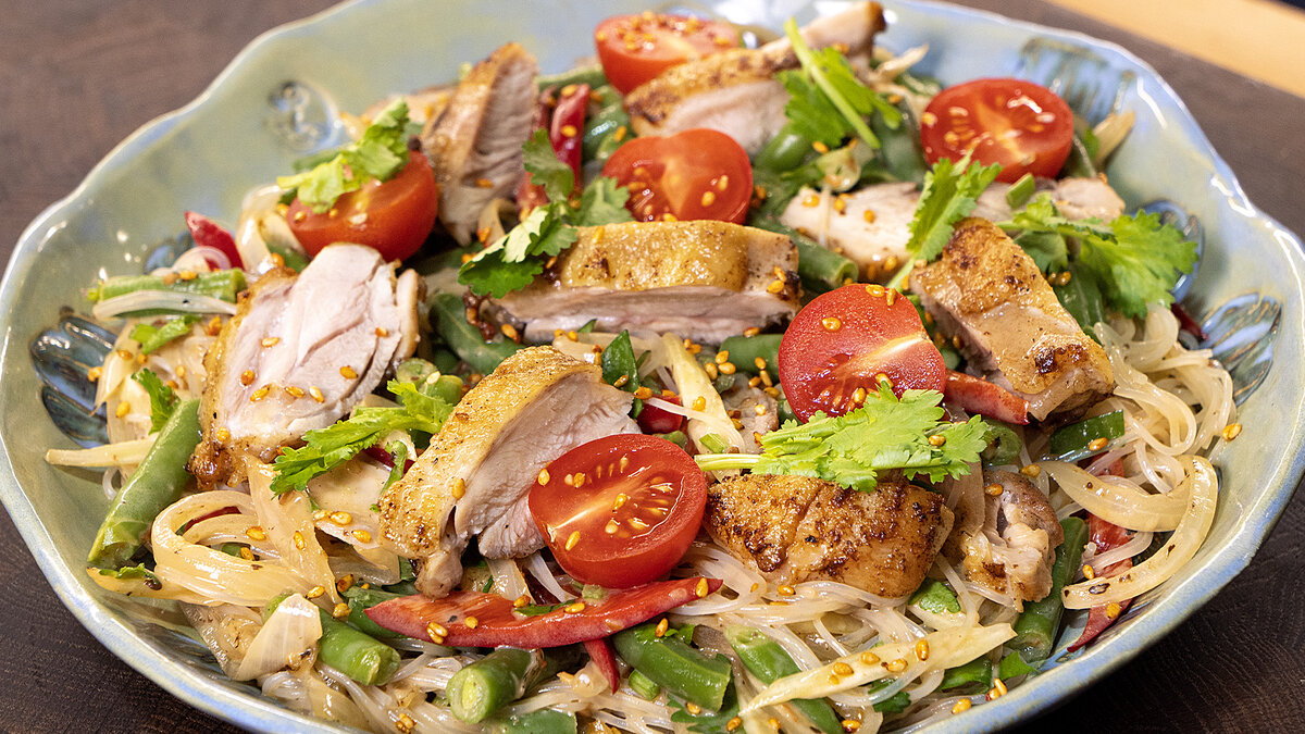 Рецепт аппетитного салата, который украсит и вкусно дополнит ваш праздничный стол. Готовится быстро и просто! Обязательно приготовьте и удивите гостей яркой и незабываемой вкусняшкой. Ингредиенты: Вермишель фунчоза - 100 г