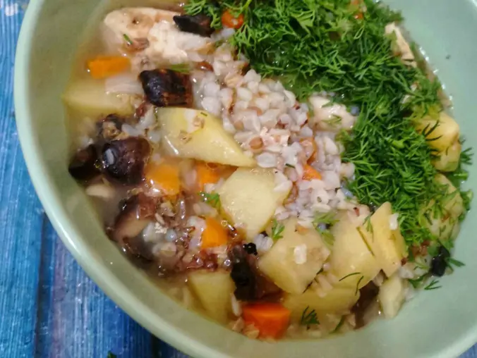 Как бульон приготовится, вытащить курицу и добавить гречку с картошкой. Варить нужно до готовности. 4 шаг
