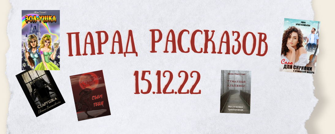 Уже третий день идёт "Парад рассказов" на портале Уютный Книжный. "Парад рассказов" - это читательский марафон малой формы. Вы читаете рассказ, пишите отзыв, публикуете его, а за это получаете призы. Поподробней об этом можно узнать, перейдя по виджету: Первый день марафона Третий день идёт (для кого-то начался четвёртый). Уже написано больше двух десятков комментариев и отзывов на самые разные рассказы, самых разных жанров (от мистики до сказки), но это - только начало. А вот самые яркие отзывы за 15.12.2022. (по моему мнению) Рассказ "Старушка", автор Евгения Высоковская Читать рассказ: https://nouname.ru/books/starushka Рассказ "Соло для скрипки с привкусом минора", автор Анна Христолюбова Читать рассказ: https://nouname.ru/books/solo-dlya-skripki-s-privkusom-minora Рассказ "Зол-ушка", автор Фэн Тезий Читать рассказ: https://nouname.ru/books/zol-ushka Рассказ "Съем тебя", автор Олария Тойе Читать рассказ: https://nouname.ru/books/sem_tebya Рассказ "Туманный альбинос", автор Анна Фе