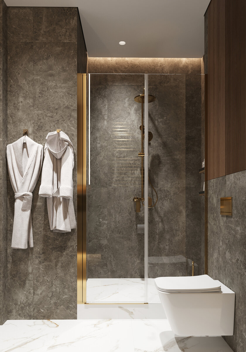 Небольшая ванная комната может быть удобной и приятной внешне в руках опытного дизайнера интерьера. В дизайне интерьера санузла, примыкающего к спальне владельцев, в ЖК Wellton Towers за основу мы взяли темную цветовую палитру. Мнение, что только светлые оттенки визуально увеличивают пространство, ошибочно. Темные тона отлично справляются с этой задачей и добавляют пространству объем. Для того, чтобы облегчить пространство, мы использовали стеклянную дверь в душе и не использовали поддон. С этой же целью мы разместили подвесную тумбу. Мебель без ножек всегда создает ощущение невесомости предмета. Для того, чтобы визуально пространство выглядело больше, было задействовано зеркало и подсветка, которая создает эффект глубины. Как и во многих наших проектах, в дизайне интерьера ванной присутствует полочка – ниша, где удобно размещать различные баночки, при этом там не скапливается вода и грязь. Все инженерные системы скрыты за панелью, которая легко открывается и обеспечивает доступ при не