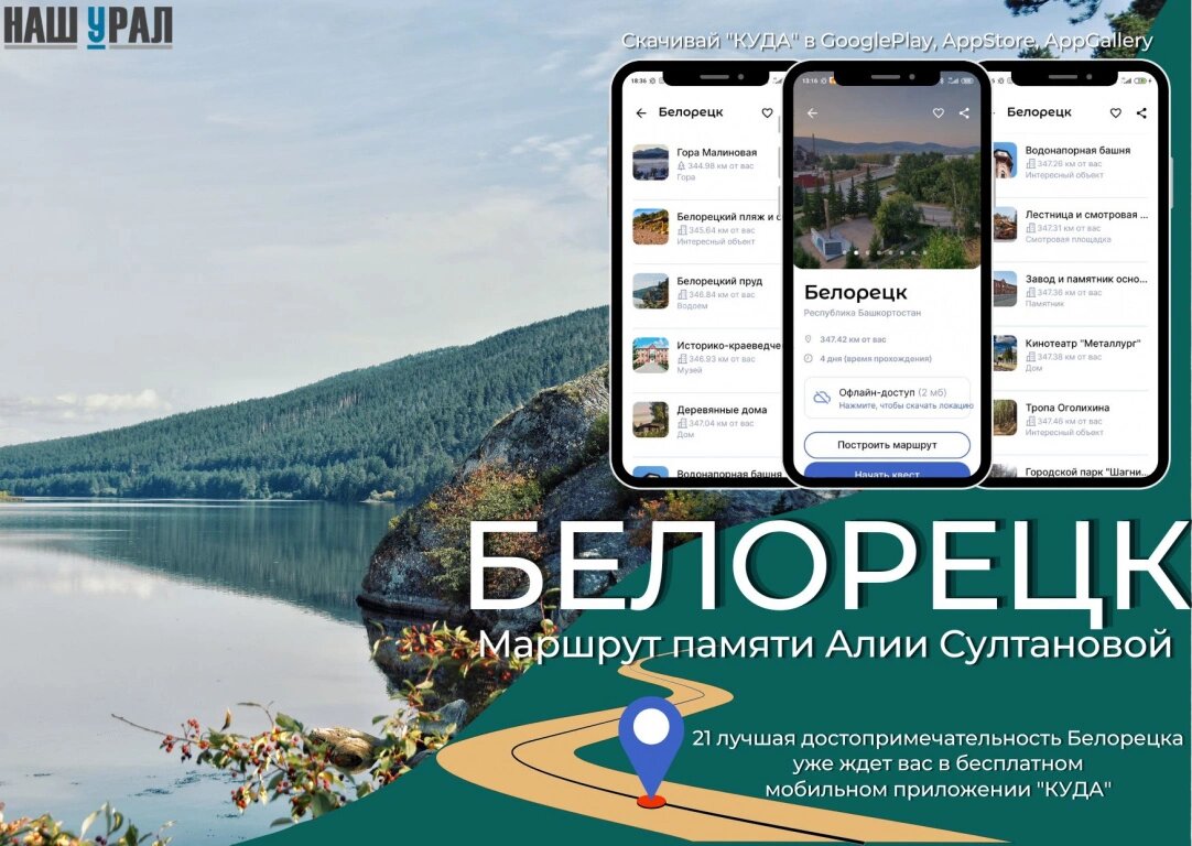 - Маршрут по Белорецку, конечно же, опубликован в нашем бесплатном мобильном приложении «КУДА» для самостоятельных путешественников! Скачивайте приложение в App Store, а также Google Play Market и AppGallery