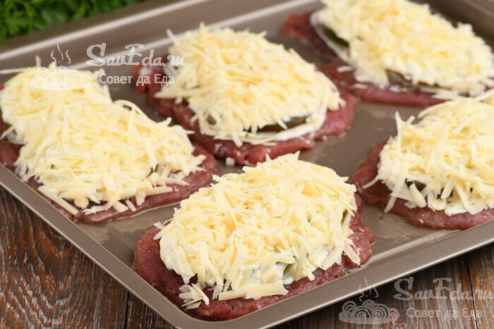 8. Сыр крупно натираем и выкладываем на помидоры с соусом. С этим соусом не надо добавлять много сыра. Решетку в духовке размещаем на предпоследнем уровне. Ставим противень в разогретую духовку при 180 градусах и готовим 30-35 минут.