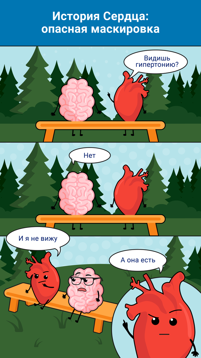 В серии комиксов «История Сердца» рассказываем, как наш мозг мешает правильно лечить сердечно-сосудистые заболевания. «Я здоров! Головные боли и усталость – это все от стресса», — говорит мозг, полагая, что плохое самочувствие вызвано внешними факторами. Никто не хочет признавать себя больным. Но такая самоуверенность может быть опасна. Почему? Артериальная гипертония получила название «тихий убийца» именно из-за того, что это заболевание на ранних этапах может протекать бессимптомно. Отсутствие симптомов вовсе не означает, что «организм справляется» — в теле человека с повышенным артериальным давлением происходят изменения, влияющие на работу сердца, почек и головного мозга. «Повышенное давление — это не болезнь и не требует лечения», — может считать мозг. Действительно, заболевание может протекать и без головных болей и тошноты, а человек — ощущать себя относительно нормально. Мозг не чувствует повышенное артериальное давление. Так происходит потому, что в сосудах нет нервных окончан