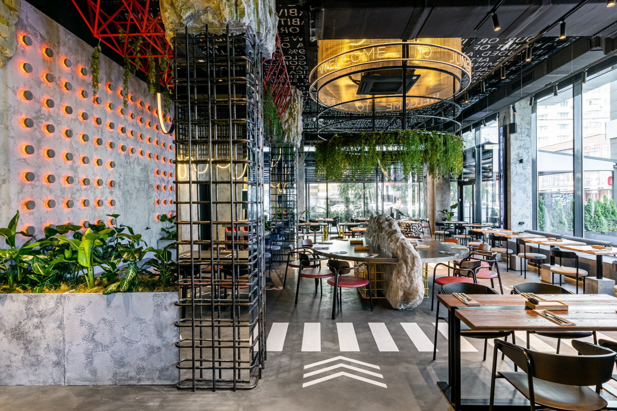 Вслед за пивным рестораном Frank от Басты открылась Gorilla — с паназиатской концепцией. Попадая внутрь, есть ощущение, что оказался в той самой популярной подростковой программе из 90-х «Джунгли зовут». Большой зал с высокими потолками и имитацией скальных глыб, доски для подачи из натурального камня и много зелени. В реальность возвращают разве что панорамные окна в пол с видом на оживленную Кубанскую набережную.