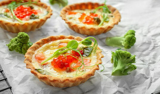 Тарталетки, запеченные со слабосоленой рыбкой и сливочной заливкой, подавайте чуть теплыми - тогда их вкус лучше раскроется, а ваши гости не обожгутся начинкой. Кстати, такие тарталетки можно сделать и с беконом. А можно сделать и ассорти. Вам понадобится: Лосось слабосоленый 100 г