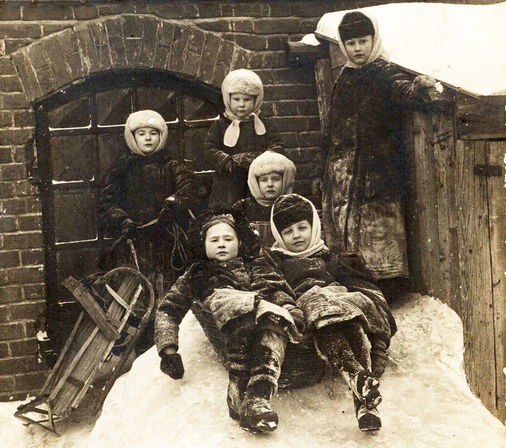 В моем архиве есть любопытная фотография. На ней изображены дети, катающиеся на санках. Две девочки на снимке известны. Справа, у сарайчика стоит Мария Клейненберг, а ее сестра Елизавета сидит в санках (справа, в шапке и платке). Это внучки бывшего председателя Смоленской казенной палаты В.Ф. Тилена, чей дом находился в Смоленске на ул. Большой Благовещенской, он не сохранился, на его месте ныне находится здание МТС (ул. Б. Советская, 26). Скорее всего, снимок сделан во дворе дома Тилена. Дата его неизвестна, но можно предположить, что это примерно 1912-1913 годы, так как Мария родилась в 1899 году, а Елизавета – в 1901-м.