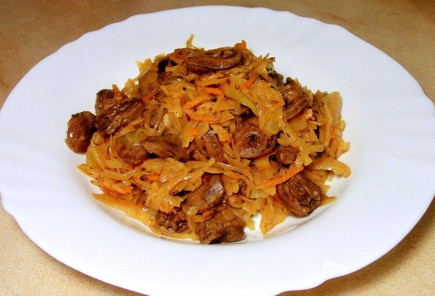 Одно из таких блюд - тушеная капуста с куриными сердечками. Спешу и с вами поделиться этим классным рецептом.